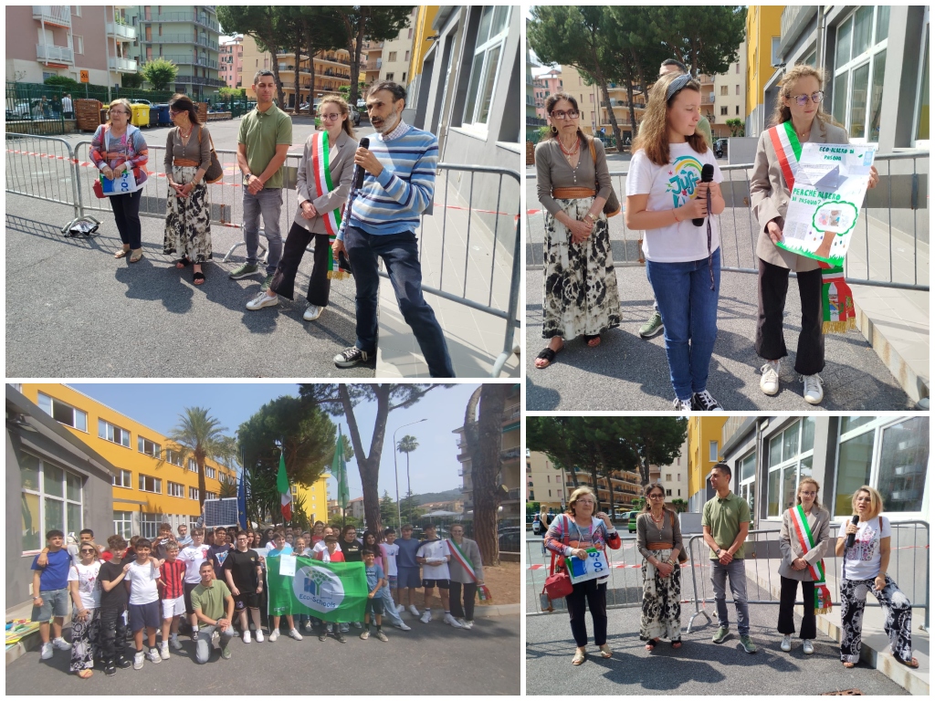 La cerimonia di consegna del vessillo si è svolta alla presenza del primo collaboratore del Dirigente Scolastico Ramona Piccoli, del referente del plesso “Benedetto Croce” Cristina Zunino, del Coordinatore del progetto Eco-Schools Fabrizio Griggio, dei docenti Amelia Malavetas, Cristina Alizeri, Giovanna Dho e Valentina Molli, del Vice Sindaco Daniele Martino, dell’Assessore Alexandra Allegri, dei Referenti della Fondazione Fee Albina Nocca e Marina Dri, del Sindaco dei Ragazzi Maurizio Giribaldi, dei componenti del Consiglio dei Ragazzi e di tutti gli allievi che hanno concorso alla produzione degli elaborati.