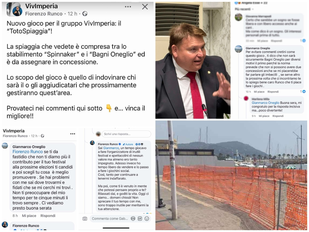 La reazione dell’assessore Oneglio non si è fatta attendere. Evidentemente infastidito dal riferimento ai Bagni Oneglio, ha risposto piccato: “Per evitare commenti cretini come questo gioco, ti dico che non sarà sicuramente Bagni Oneglio per diversi motivi, il primo perché la norma prevede che non si possono avere due concessioni, anche se mi piacerebbe far parlare gli imbecilli. Se serve altro la prossima volta che ci incontriamo te lo spiego bene caro Runco che ti piace fare i giochi“.