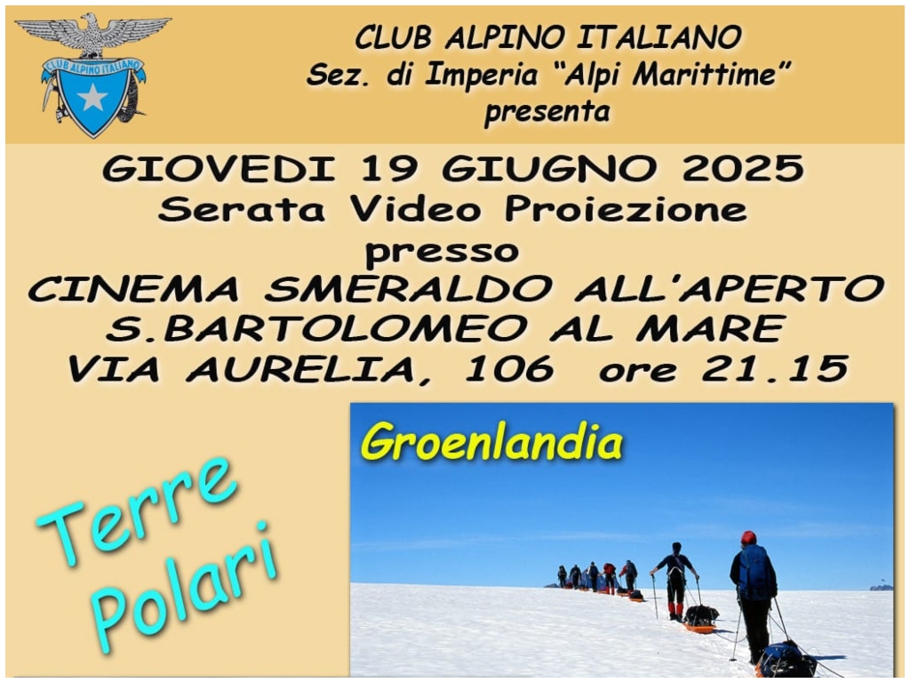 Il Club Alpino Italiano Sezione di Imperia propone una serata di video proiezioni presso il Cinema all’aperto Smeraldo di San Bartolomeo al Mare per la serata di Giovedì 19 giugno alle ore 21,15. L’evento sarà a cura del socio del CAI Ramoino Zefferino, fotografo e alpinista.