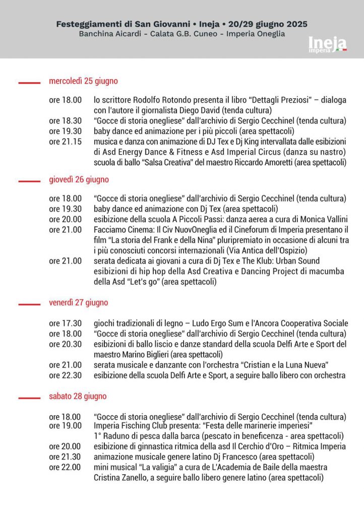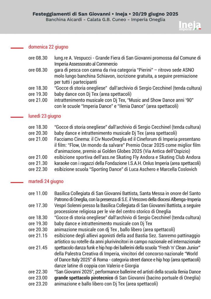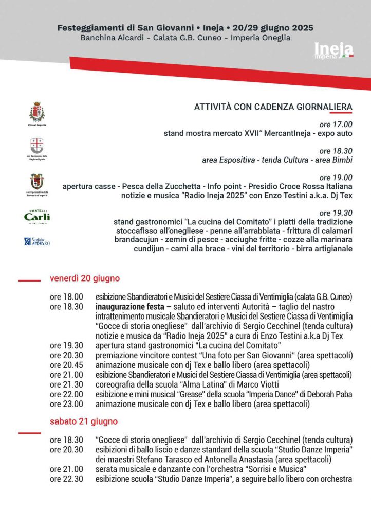 Tutto pronto per la tradizionale Festa di San Giovanni a Oneglia. Da domani 20 giugno la manifestazione tornerà ad animare Calata Cuneo con dieci giorni di eventi fino al 29 dello stesso mese.