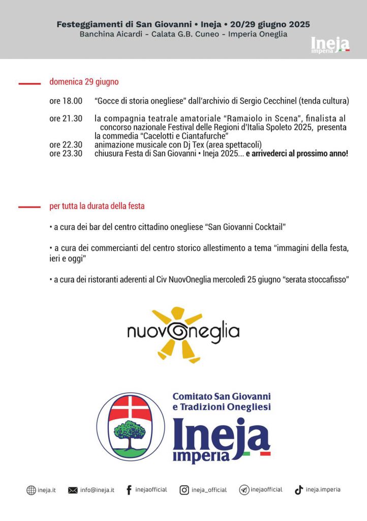 Un’edizione questa, la 45a, che vede per la prima volta la partnership con il Civ NuovOneglia che, tra le altre cose, si occuperà anche dell’organizzazione dei fuochi d’artificio, alleggerendo il carico di lavoro del Comitato. Inoltre, porterà la festa all’interno del tessuto commerciale di Oneglia.