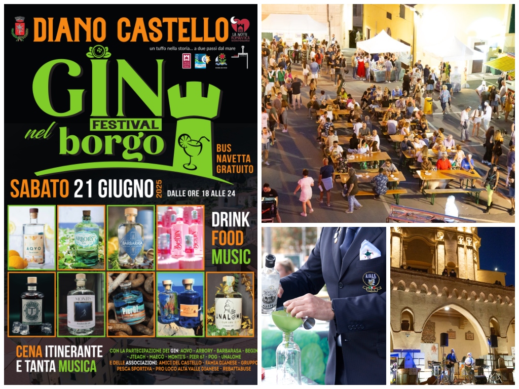 L’apertura dell’estate, a Diano Castello, è all’insegna di drink, food & music. Sabato 21 giugno va in scena, per la terza volta, Gin nel Borgo Festival, l’evento dedicati ai distillati di bacche di ginepro fortemente collegati con il territorio e connotati dalla presenza di botaniche e materie prime tipiche della nostra regione. Appuntamento, dalle ore 18 alle 24, in piazza Matteotti e in varie location del centro storico con cena itinerante e proposte musicali di diverso genere, per trascorrere una piacevole serata tra vie e le piazzette di uno dei Borghi più belli d’Italia.