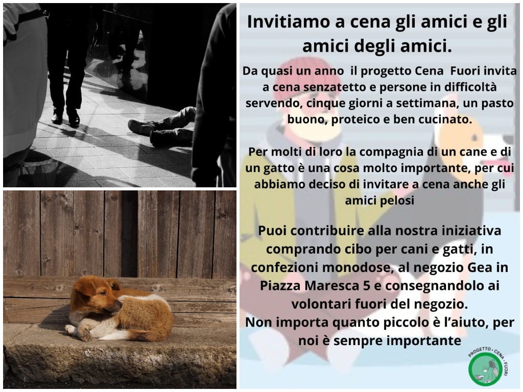Ma da oggi l’invito a cena si estende anche agli “amici degli amici”: cani e gatti che accompagnano molte persone senza fissa dimora e rappresentano per loro un punto di riferimento affettivo fondamentale. Parte così una raccolta di cibo monodose per animali, acquistabile presso il negozio Gea in Piazza Maresca 5, dove i volontari saranno presenti per ricevere le donazioni.
