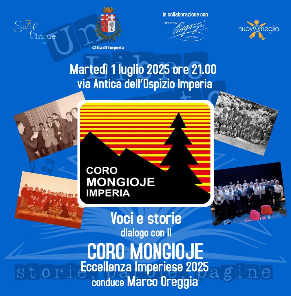 Sarà il Coro Mongioje, storica eccellenza corale della provincia, ad aprire martedì 1° luglio la settima edizione di “Un Libro Aperto – Storie, parole, pagine”, la rassegna letteraria estiva curata dall’Associazione SetteCinque in collaborazione con il Comune di Imperia del CIV NuovOneglia e della Libreria Ragazzi. L’appuntamento, molto atteso dai lettori e dagli amanti della cultura, animerà via Antica dell’Ospizio per tutto luglio e agosto con un fitto calendario di incontri tra autori, romanzi, musica e racconti.