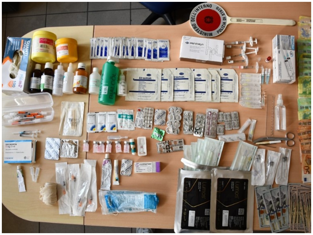 Presso l’abitazione dell’individuo gli agenti hanno rinvenuto e posto in sequestro materiale sanitario e dispositivi medici utilizzati per effettuare trattamenti di medicina estetica, agende contenenti annotazioni dettagliate riconducibili a prestazioni sanitarie non autorizzate oltre ad alcune migliaia di euro e dollari.