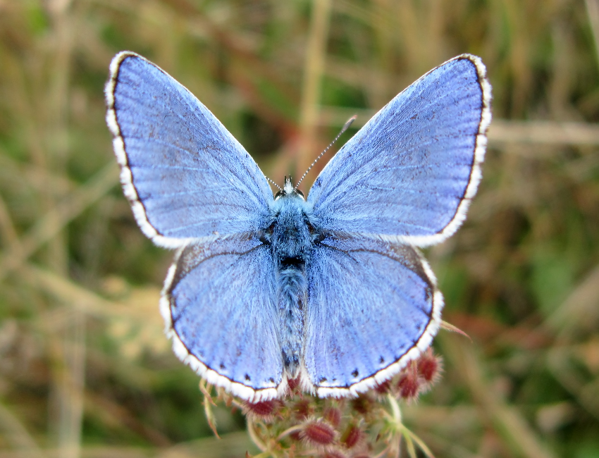 Nell’entroterra ligure si può osservare una farfalla che sembra aver catturato un pezzo di cielo azzurro, spargendolo sulle proprie ali. È il caso del Bellargo (Lysandra bellargus), specie caratterizzata da uno spiccato dimorfismo sessuale. Mentre i maschi hanno una colorazione azzurro elettrico brillante le femmine, pur avendo la stessa apertura alare e forma delle ali, sono quasi completamente marroni.