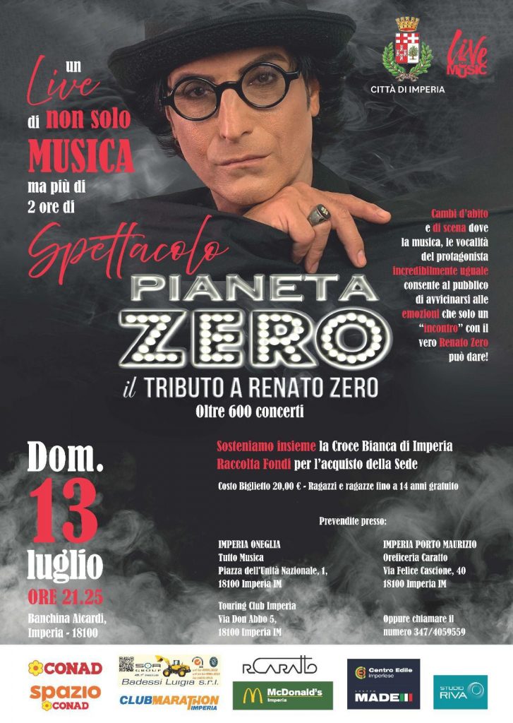 Un concerto per una buona causa. Domenica 13 luglio alle 21.25 la Banchina Aicardi di Imperia ospiterà “Pianeta Zero“, il tributo a Renato Zero che promette oltre due ore di spettacolo tra musica, cambi d’abito e scenografie.