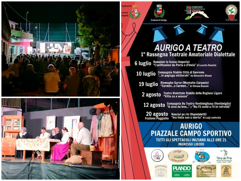 Folto pubblico, applausi convinti e divertimento per la prima serata della rassegna teatrale organizzata dal comune di Aurigo dove la compagnia imperiese “Ramaiolo in Scena” ha rappresentato lo spettacolo “L’unificasion du Portu e d’Ineia” di Lucetto Ramella.