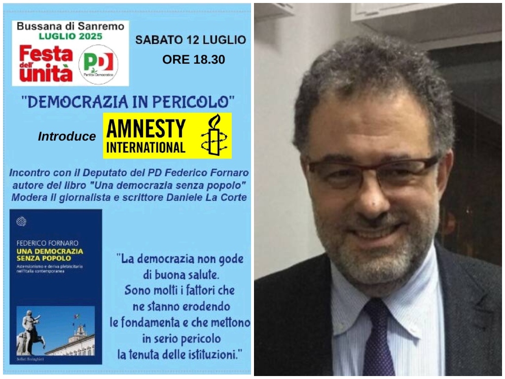 La democrazia è davvero in pericolo? Se ne parlerà sabato 12 luglio alle 18.30 a Bussana, durante la Festa dell’Unità del Partito Democratico. Protagonista dell’incontro sarà il deputato Federico Fornaro, che presenterà il suo libro “Una democrazia senza popolo”.