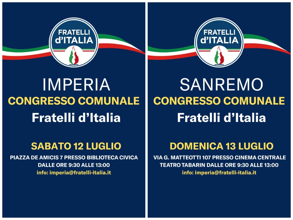 Week end di congressi cittadini per Fratelli d’Italia in provincia di Imperia. Sabato 12 luglio presso la biblioteca civica di Imperia si svolgerà il congresso cittadino del partito di Giorgia Meloni. Alle 9.30 si inizierà con i saluti delle autorità a cui seguirà la presentazione dei candidati e la discussione programmatica.