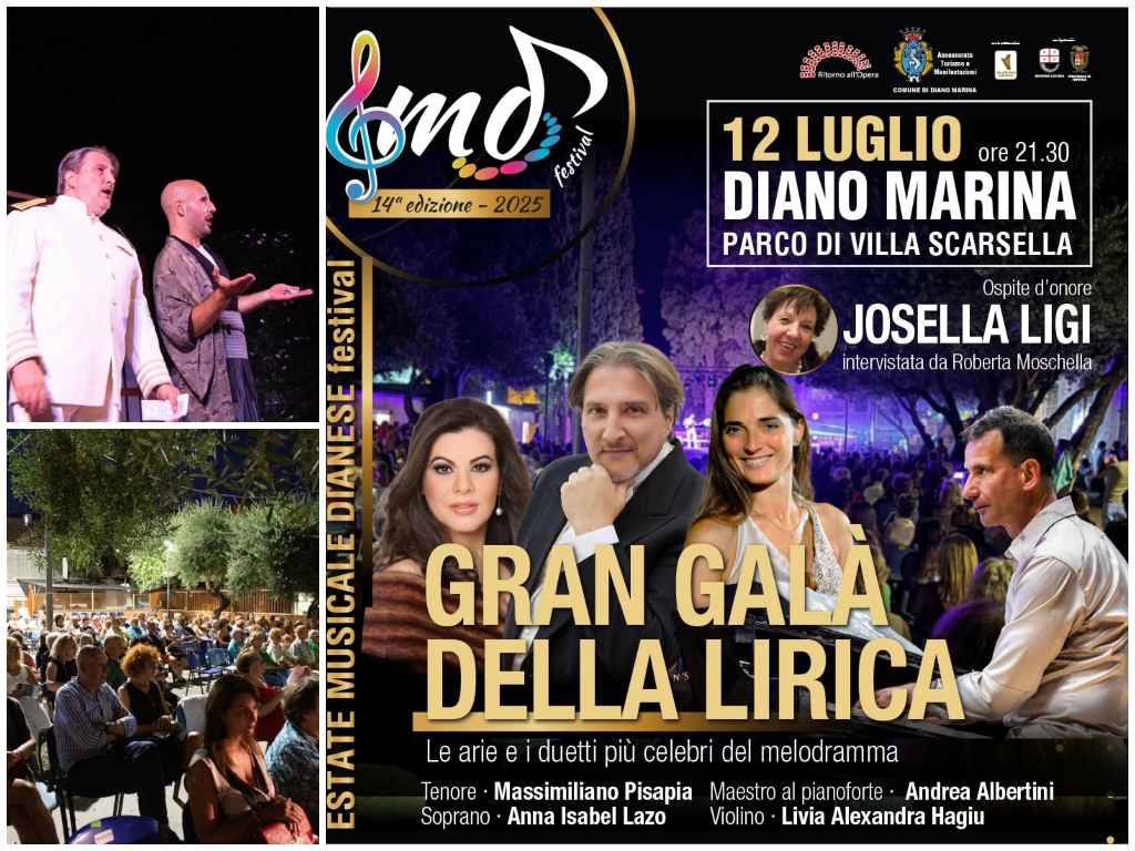 Sul palco quattro artisti di notevole spessore per una serata che regalerà forti emozioni: il tenore Massimiliano Pisapia, la soprano Ana Isabel Lazo, la violinista Livia Hagiu e il maestro-pianista Andrea Albertini. Ospite d’onore sarà la soprano di origini imperiesi Josella Ligi, la quale sarà intervistata da Roberta Moschella e riceverà il Premio Città di Diano Marina per la sua straordinaria carriera.