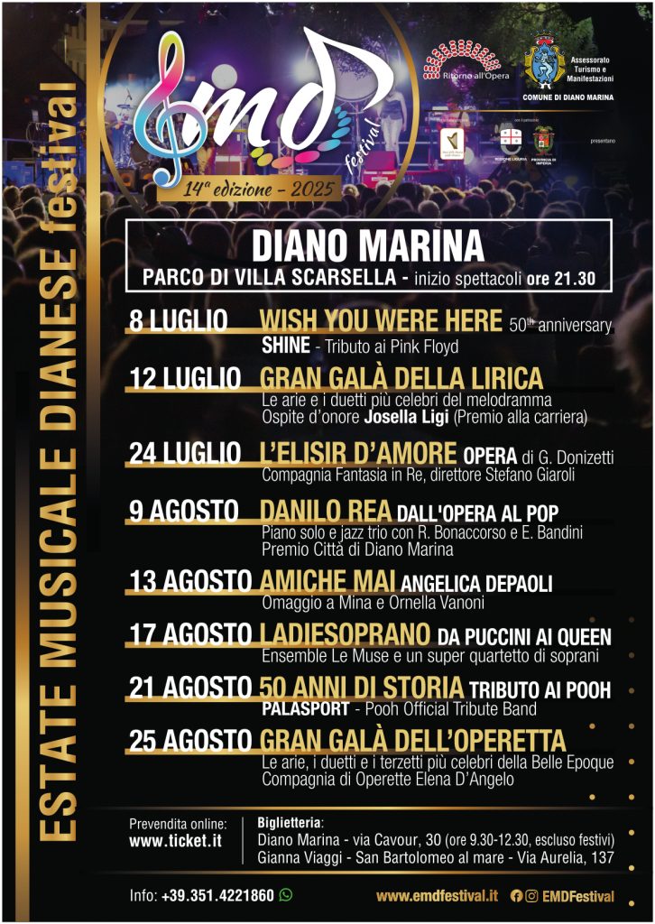 Il 14° Emd Festival è organizzato dall’associazione Ritorno all’Opera con la collaborazione dell’associazione Amici della Musica del Golfo Dianese, con la partecipazione e il sostegno del Comune di Diano Marina e il patrocinio di Regione Liguria e Provincia di Imperia.