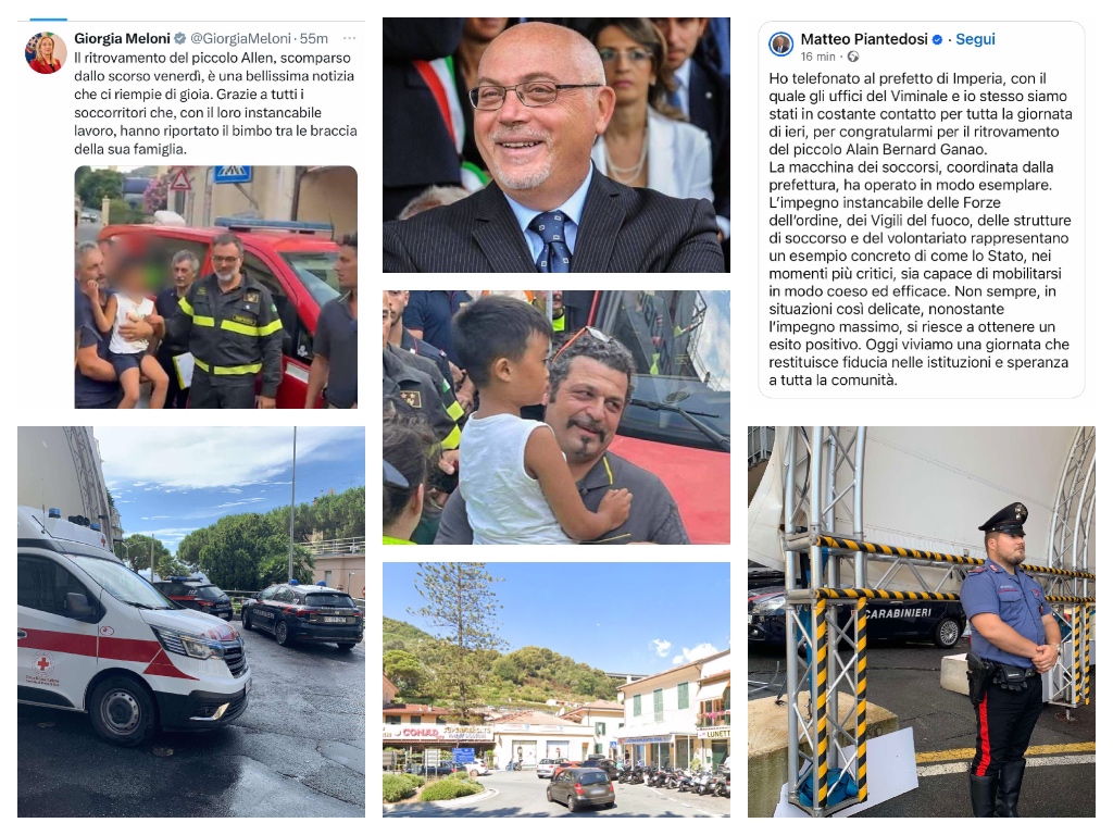 “Ho telefonato al prefetto di Imperia – scrive il Ministro Piantedosi -, con il quale gli uffici del Viminale e io stesso siamo stati in costante contatto per tutta la giornata di ieri, per congratularmi per il ritrovamento del piccolo Alain.