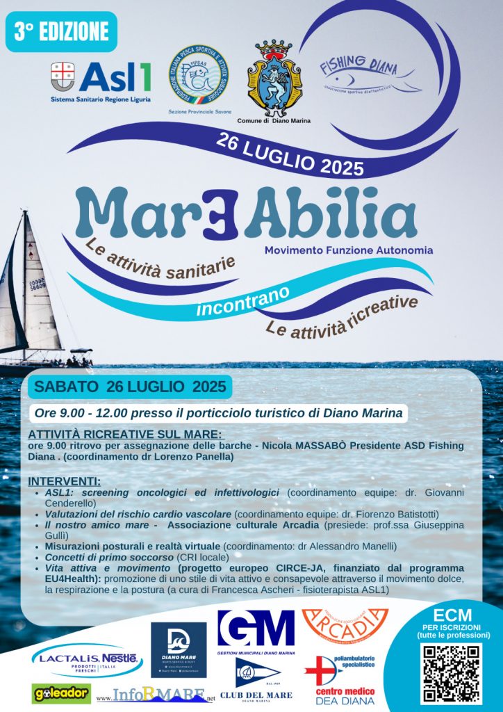 Tutto pronto per la terza edizione di “Mareabilia” l’evento in cui le attività sanitarie si fondono con quelle ricreative, per una giornata dedicata movimento e al benessere, per grandi e piccini. Il 26 luglio presso il porticciolo turistico di Diano Marina, dalle 9 alle 12, si terranno momenti ludici e non, come ad esempio un giro in barca dedicato a persone con disabilità, oltre a dibattiti su diversi temi sanitari e di benessere fisico. Sarà occasione per parlare di screening oncologici e infettivologi, del rischio cardiovascolare, misurazioni posturali e realtà virtuale, concetti di primo soccorso e vita attiva e movimento.