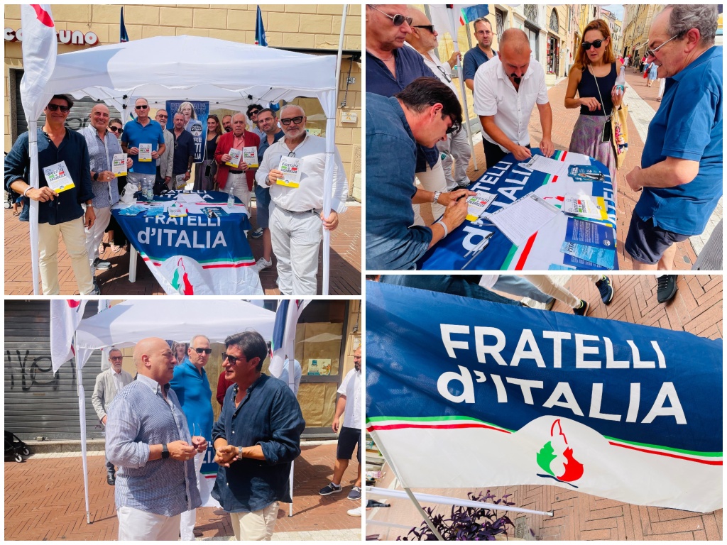 Si è svolto oggi in P.zza San Giovanni il gazebo di Fratelli d’Italia Imperia. Alla presenza del Sen. Berrino dei dirigenti cittadini e dei coordinatori di dipartimento, sono stati distribuiti volantini sull’attività del governo Meloni e raccolte diverse adesioni al Partito. Presente oltre il cons. com.le Alessandro Casano, Manuela Sasso Sindaco di Molini di Triora e consigliere provinciale.