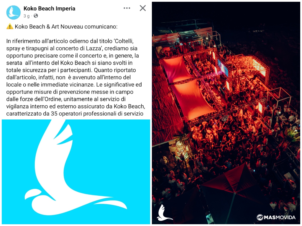 “In riferimento all’articolo odierno dal titolo ‘Coltelli, spray e tirapugni al concerto di Lazza’, crediamo sia opportuno precisare come il concerto e, in genere, la serata all’intento del Koko Beach si siano svolti in totale sicurezza per i partecipanti.