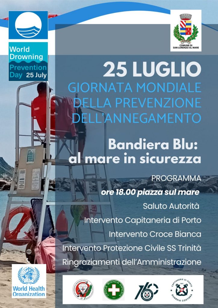 Questa due giorni avrà la sua conclusione con un grande evento, alle ore 18.00, infatti nella piazza lungo la passeggiata mare, si celebrerà la seconda Giornata Mondiale della Prevenzione dell’Annegamento. Un’occasione promossa da Bandiera Blu, vanto del Comune di San Lorenzo da molti anni, per riflettere sui pericoli e sulle insidie che si possono incontrare. Presenti la Capitaneria di Porto, la Croce Bianca e la Protezione Civile SS. Trinità che affronteranno questa importante tematica ognuno dalla propria ottica di competenza.