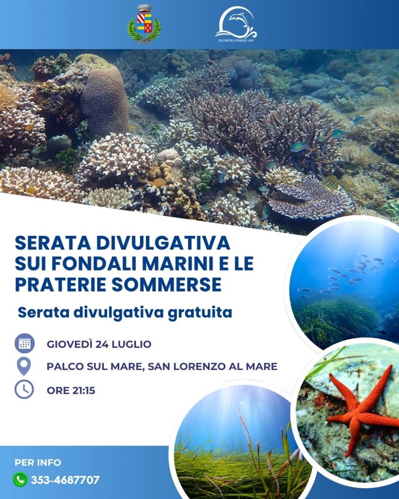 A seguire un Laboratorio a cura del Laboratorio Pape. L’incontro avverrà a partire dalle ore 17,30 nel campo da Beach Volley e si avvarrà della presenza anche della Protezione Civile della SS. Trinità. A partire dalle ore 21.15 ci sarà una serata divulgativa sui fondali marini e le praterie sommerse con video e immagini di ciò che di solito non si vede, ma che valorizza il nostro territorio, a cura dei Delfini del Ponente.