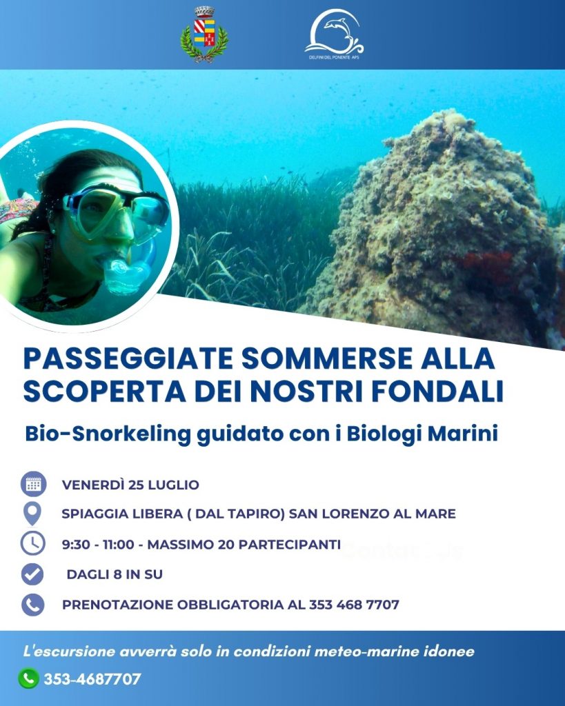 Venerdì 25 Luglio ci sarà uno degli appuntamenti che riscuote sempre un grande successo tra i ragazzi e cioè il Bio-Snorkeling guidato con i Biologi Marini per ragazzi a partire da 8 anni. Ritrovo alle ore 9.30 dalla spiaggia libera (prenotazione obbligatoria al 353 4687707).