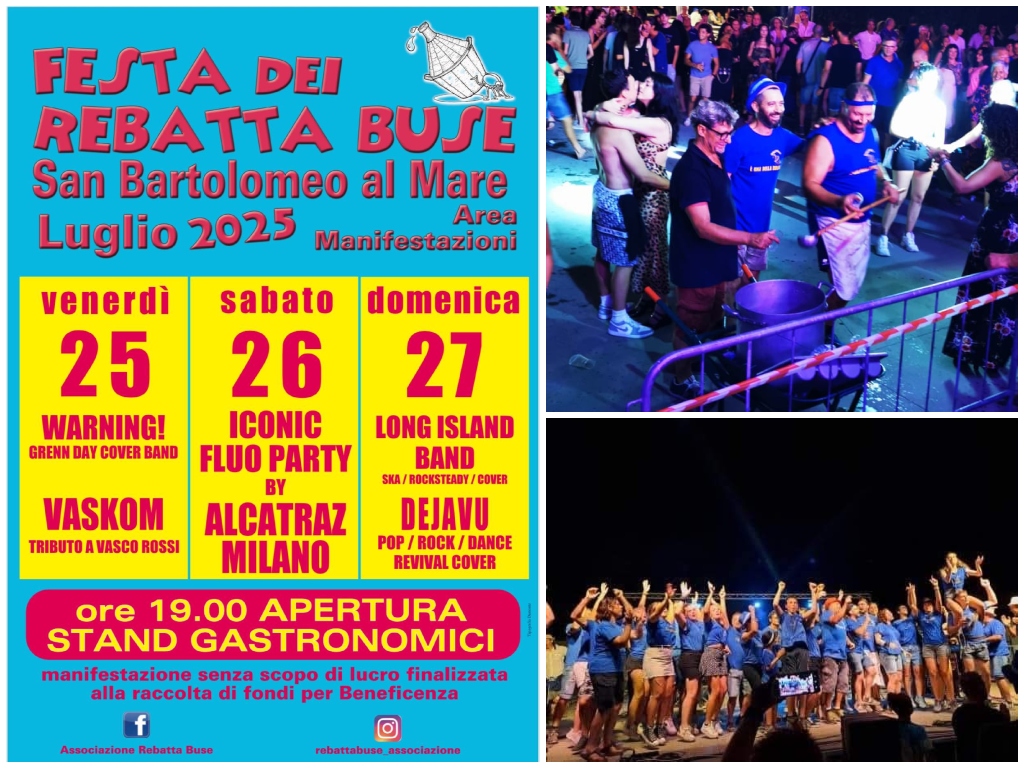 Tre giorni di festa da venerdì 25 a domenica 27 luglio. Sarà un weekend di fine luglio frizzate a San Bartolomeo per la “Festa dei Rebatta Buse”. L’encomiabile associazione di volontariato. Ad organizzare l’evento un gruppo di volontari molto affiatato che darà vita ad una tre giorni di cibo e buona musica. Piazzale Olimpia, ovvero l’Area Manifestazioni di San Bartolomeo al Mare, è pronta a trasformarsi in un palcoscenico musicale di grande livello, ospitando gruppi di varie estrazioni musicali per dare vita ad un happening sfrenato e festoso grazie alla collaborazione del Comune e di diversi sponsor.
