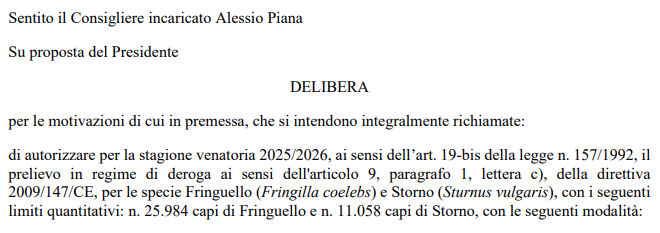 - 25.984 Fringuelli e 11.058 Storni in Liguria (previsti dalla DGR n. 335 del 10/7/2025) – Visionabile in modo integrale cliccando qui