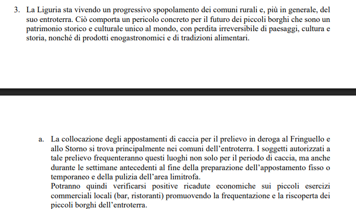 Sostenere che sfalciare l’erba intorno a un appostamento fisso di caccia sia un’opera di “miglioramento ambientale” e capace addirittura di contribuire a “combattere l’erosione e il dissesto idrogeologico” è pura fantasia. La Regione Liguria arriva ad affermare che la caccia in deroga possa contrastare lo spopolamento delle aree interne: un’altra affermazione risibile, basata sulla vaga supposizione che i cacciatori “frequenteranno bar e ristoranti”.