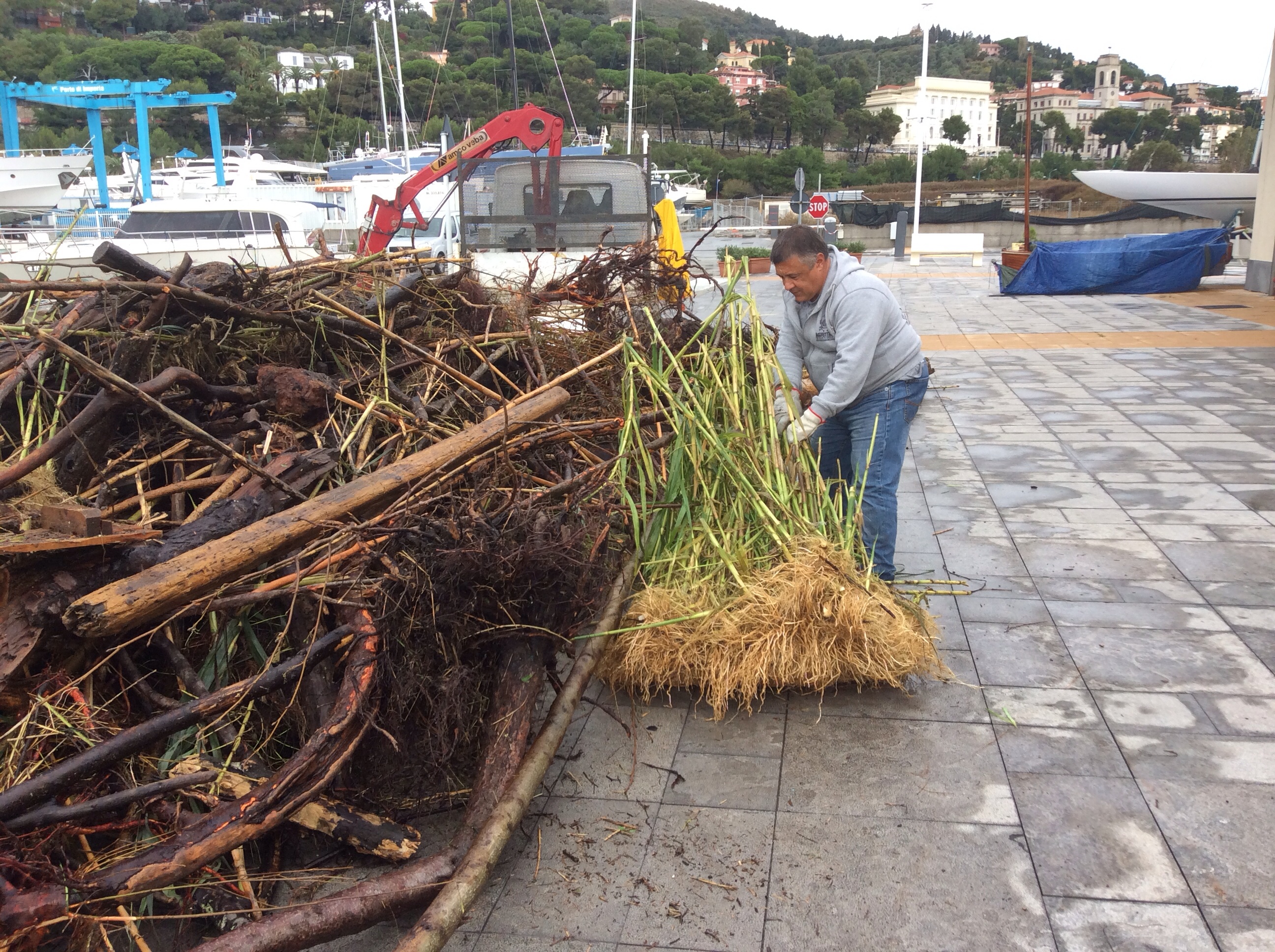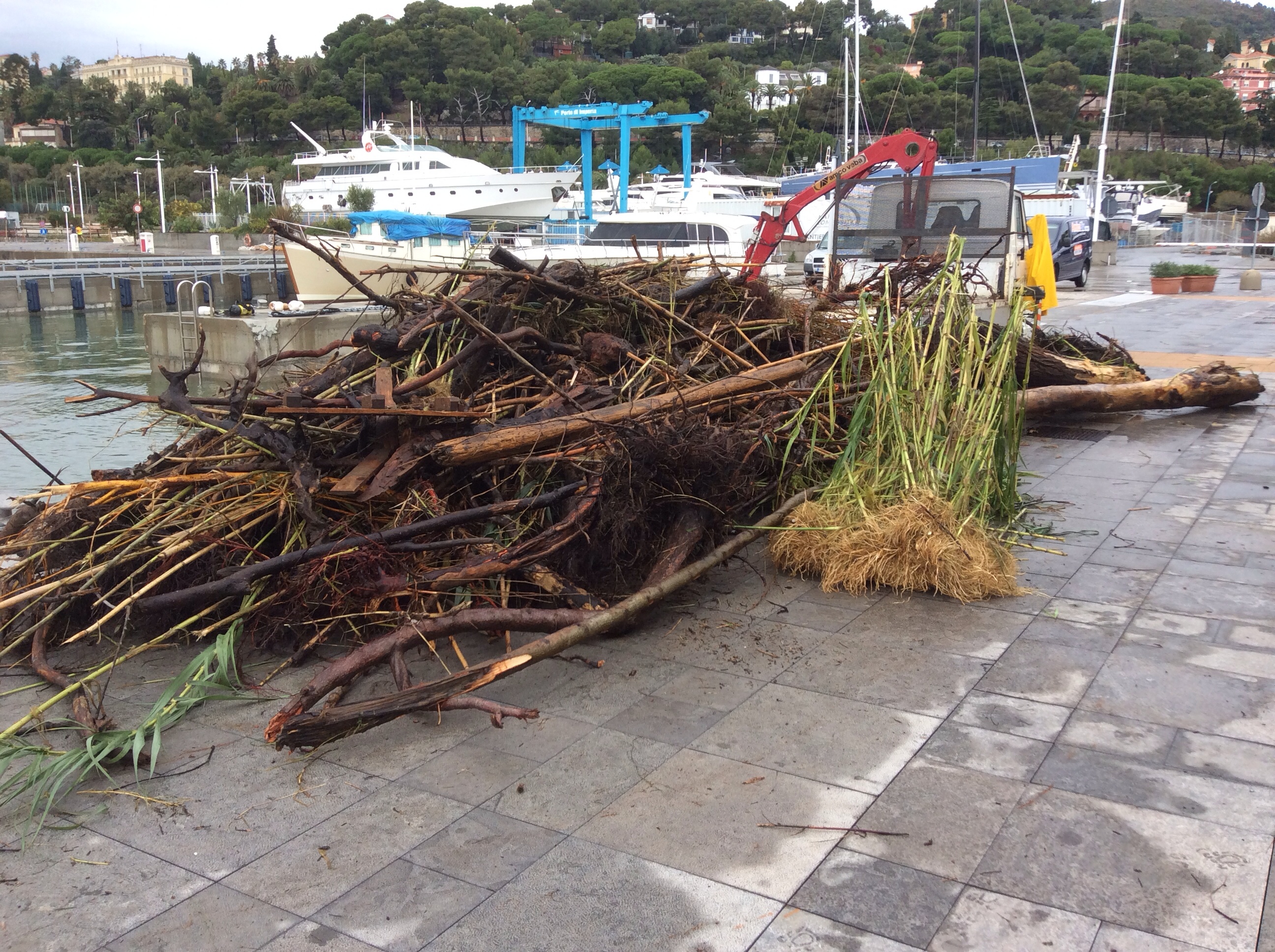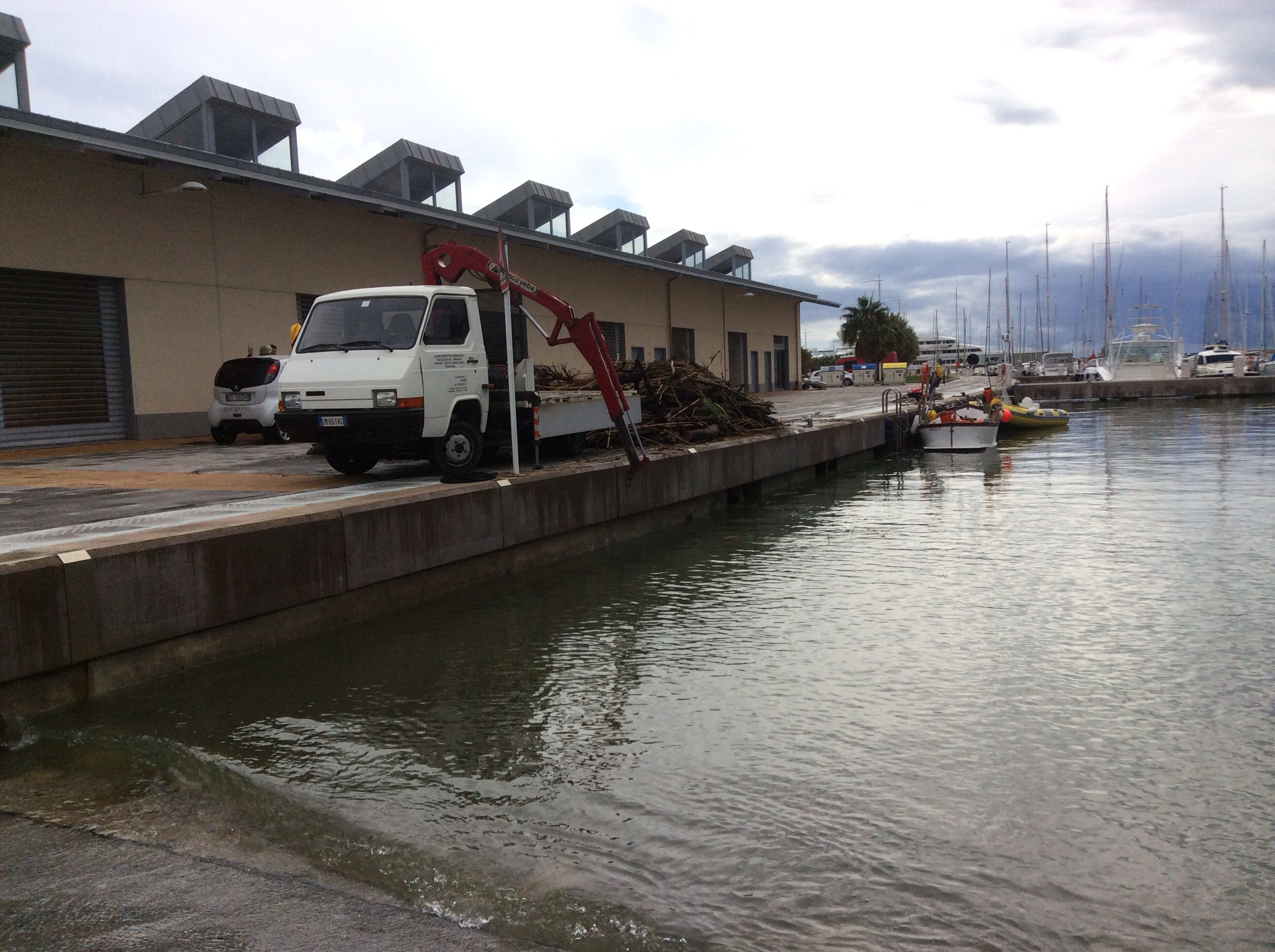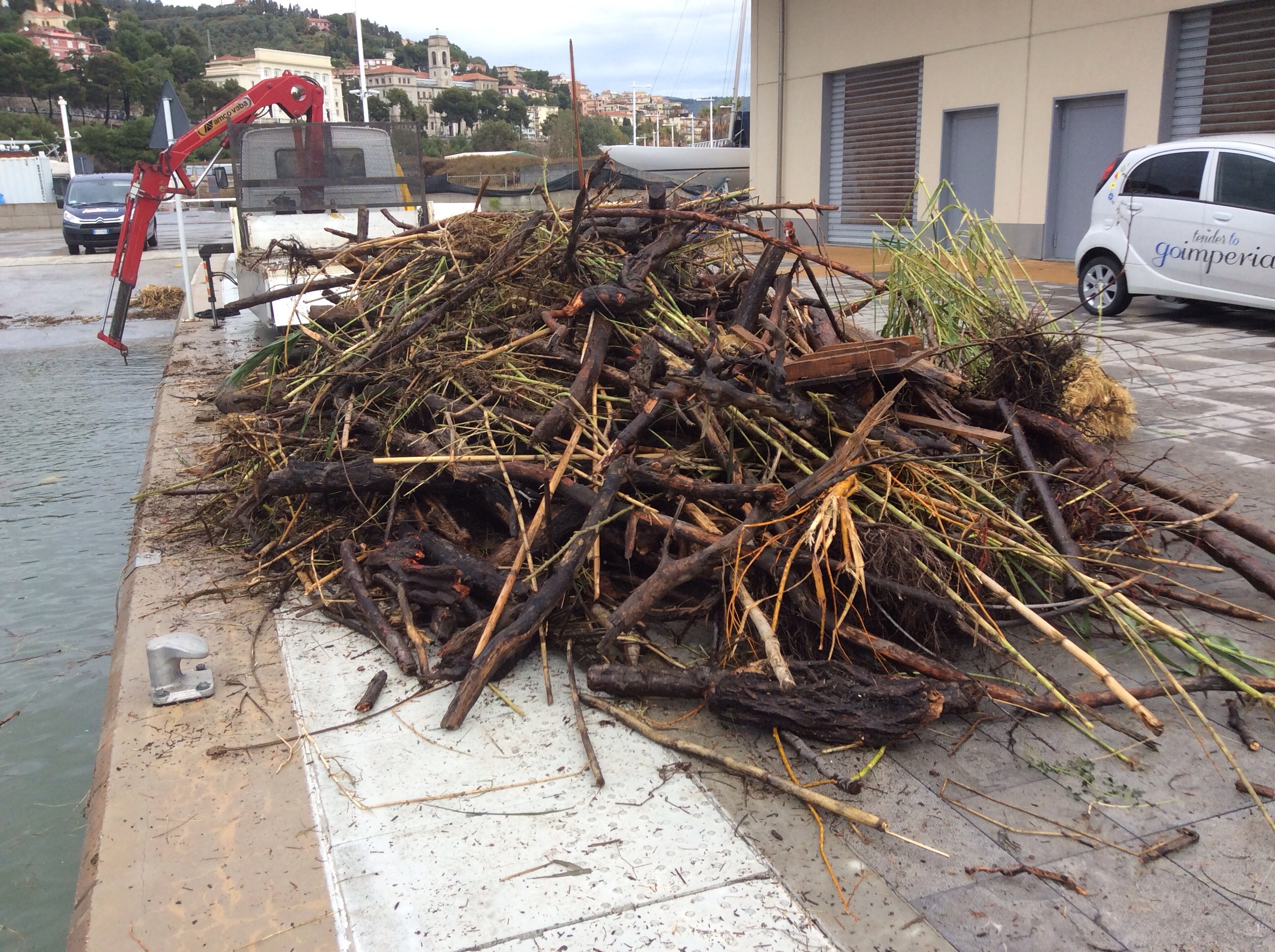 Impressionante la mole di detriti recuperati, tra cui veri e propri tronchi di alberi di pino e di eucalipto. I dipendenti della Go Imperia hanno lavorato in mare, a bordo di un gommone, trasportando e trainando i detriti sino al pontile del molo San Lazzaro dove un camioncino con una gru della Marittima Sub Service ha provveduto al recupero.