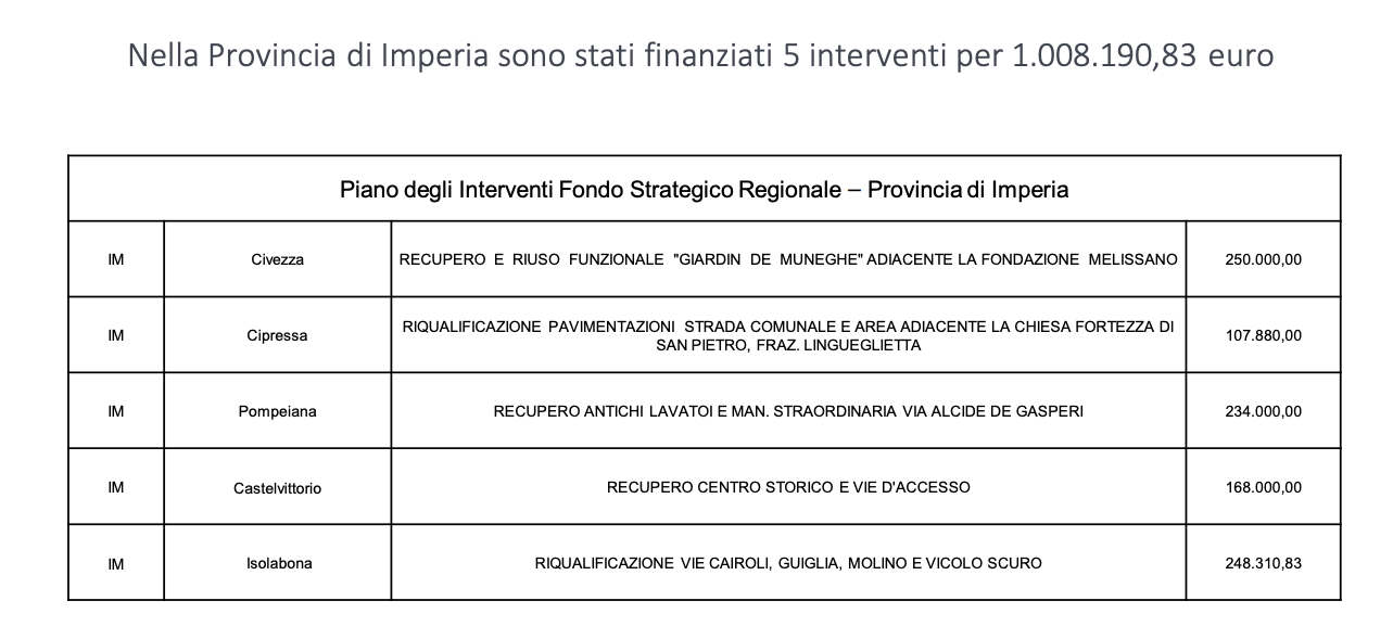 Una giornata significativa. Abbiamo presentato e parliamo di 14 interventi in tutta la regione, 5 nella provincia di Imperia e sono toccati i comuni di Pompeiana, di Civezza, di Cipressa, di isolabona, di Castelvittorio, tutti nel programma 2125 di rigenerazione urbana.