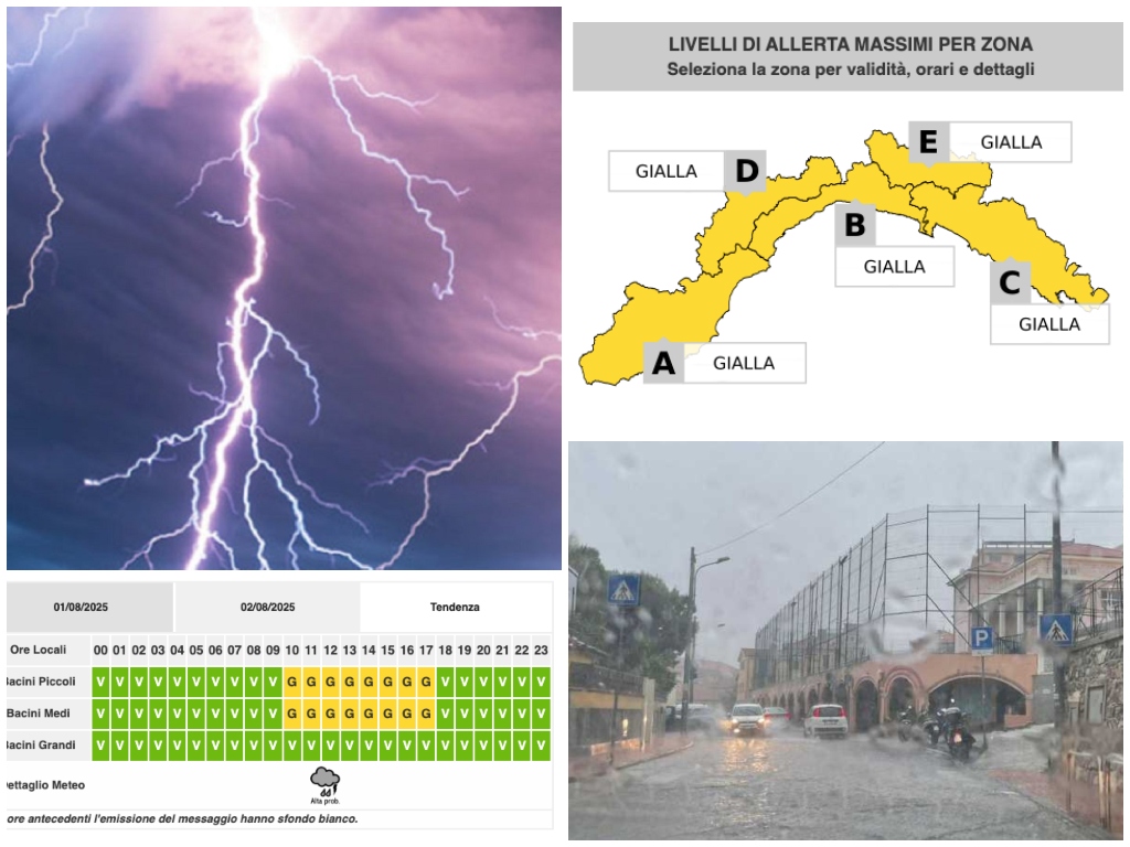 Arpal emette allerta gialla per temporali sul centro levante della regione (Zone BCDE) dalle 00:00 alle 18:00 di domani, sabato 2 agosto, sul ponente (Zona A) l’allerta gialla per temporali sarà dalle 12:00 alle 18:00 di domani.