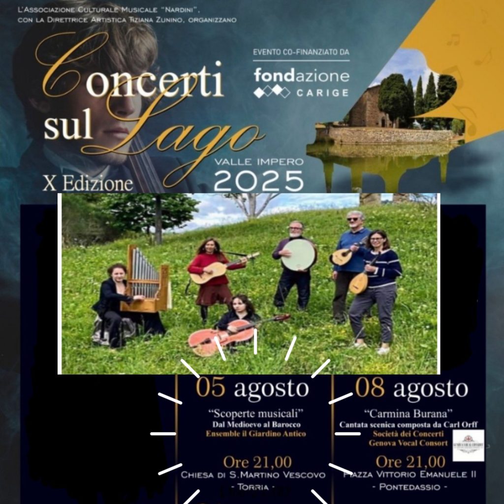 Le sorprese però non sono finite: martedì 5 agosto la rassegna Concerti sul Lago ospiterà un gruppo che si è già ritagliato una posizione di tutto rispetto nel panorama musicale ligure: l’ensemble Il Giardino Antico, che, specializzato nel repertorio barocco, non disdegna incursioni nella musica medievale e rinascimentale. Il concerto sarà anche un’occasione preziosa per conoscere e ascoltare da vicino alcuni strumenti tipici della musica antica, come il mandolino barocco, il clavicembalo, l’organo portativo, la ghironda e la chitarra barocca.