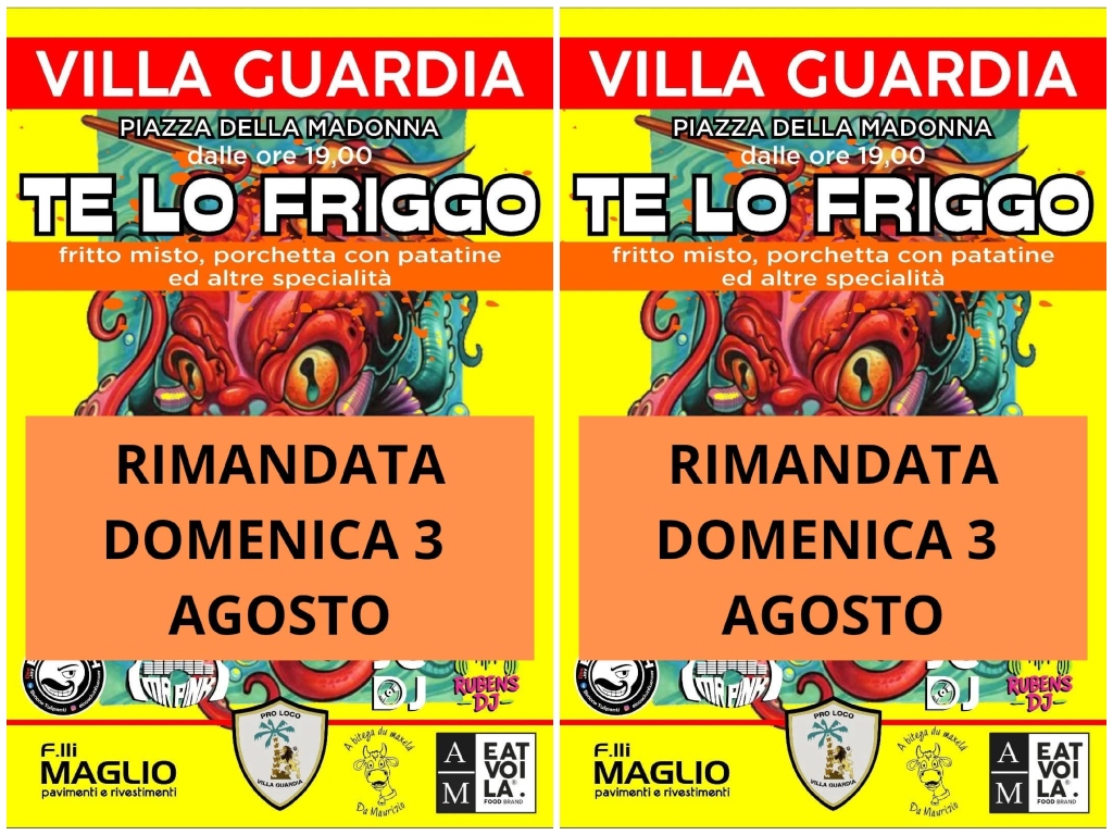 È stato rimandato a questa sera il secondo degli appuntamenti con “Te lo Friggo“, l’evento organizzato dalla Pro Loco di Villa Guardia che è stato annullato, nella serata di ieri, a causa della pioggia.