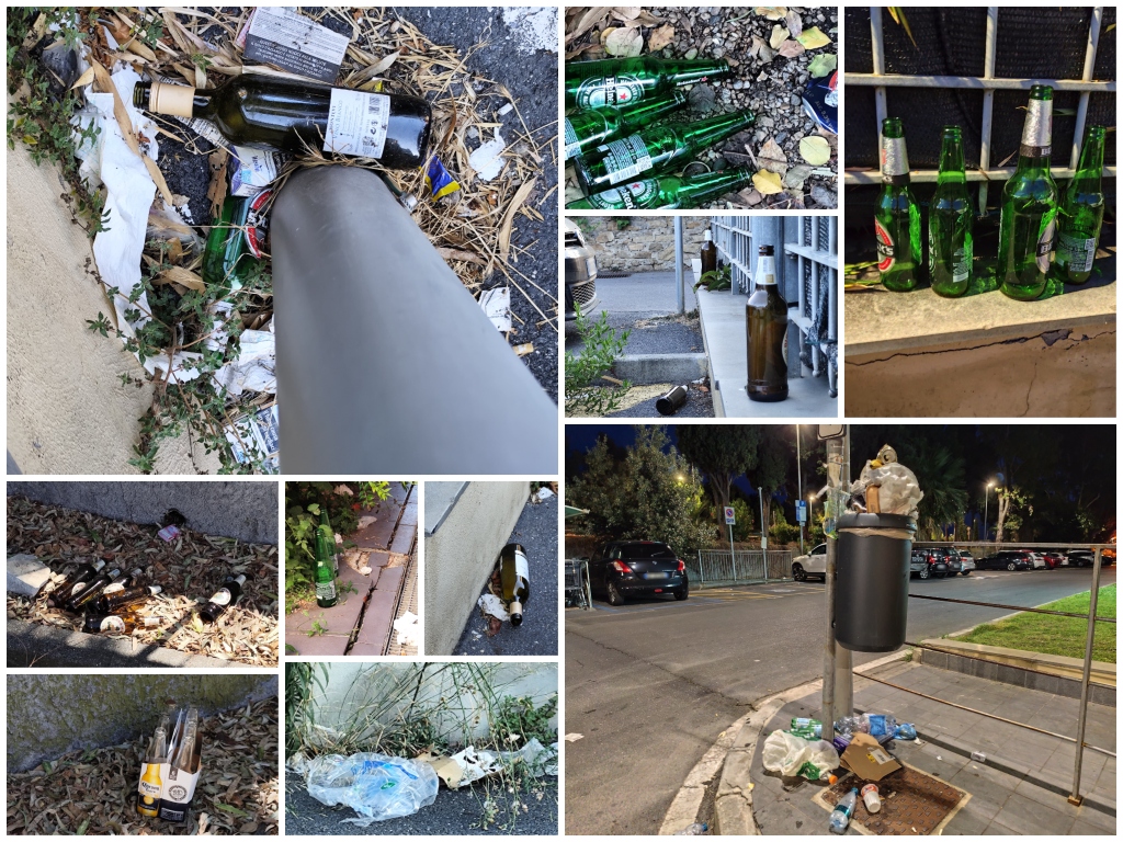 “L’unico cestino presente nella zona ogni sera straborda di immondizia, che molti maleducati gettano direttamente a terra – dichiara il lettore – È una situazione insostenibile. Gli spazzini ogni mattina raccolgono la spazzatura ma le bottiglie a bordo strada e nelle aiuole non vengono toccate. La zona è spesso raduno di ubriachi, nessuno viene mai a controllare, si vedono solo vigili a controllare la auto parcheggiate e nulla più”.