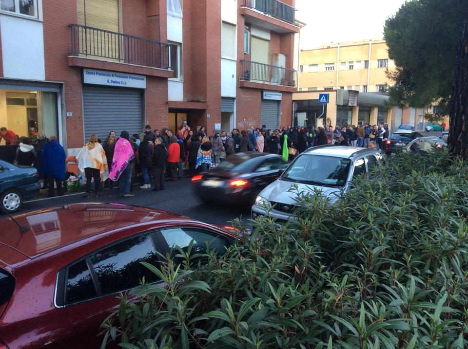 Imperia. Sono le dieci e mezza di sera, piove e fa freddo. E’ la serata ideale per stare a casa insieme alla propria famiglia e cenare tutti insieme con la certezza che l’indomani ci si alzerà e si andrà a lavorare. Invece per Sonia non è così. Lei e altre 50 persone provenienti da tutta la provincia, Sanremo, Ventimiglia, Bordighera… hanno passato la notte tra mercoledì e giovedì 13 novembre sotto la pioggia, in mezzo alla strada e hanno “dormito” fuori dal Centro di Formazione Pastore dove, questa mattina, ci sono le iscrizioni per poter accedere ad un corso a pagamento (2500 euro) per avere la qualifica di OSS.
