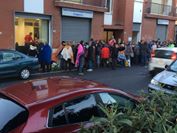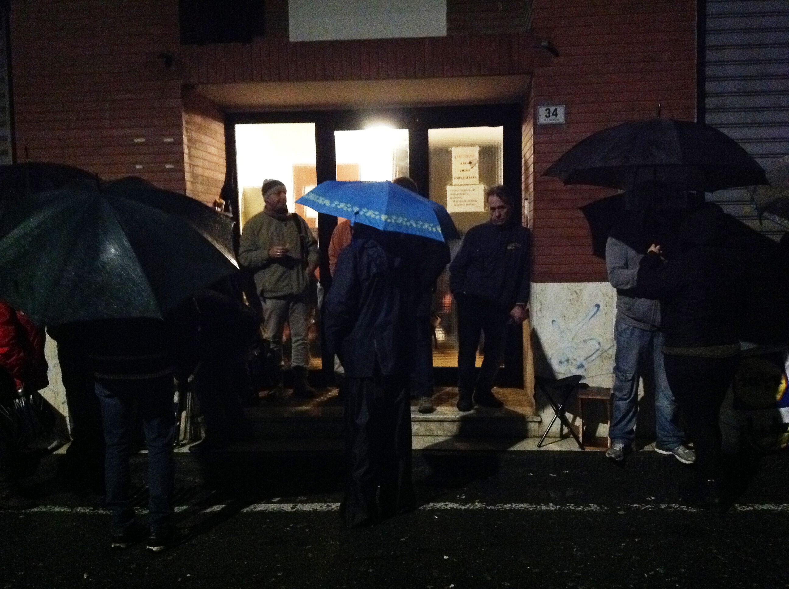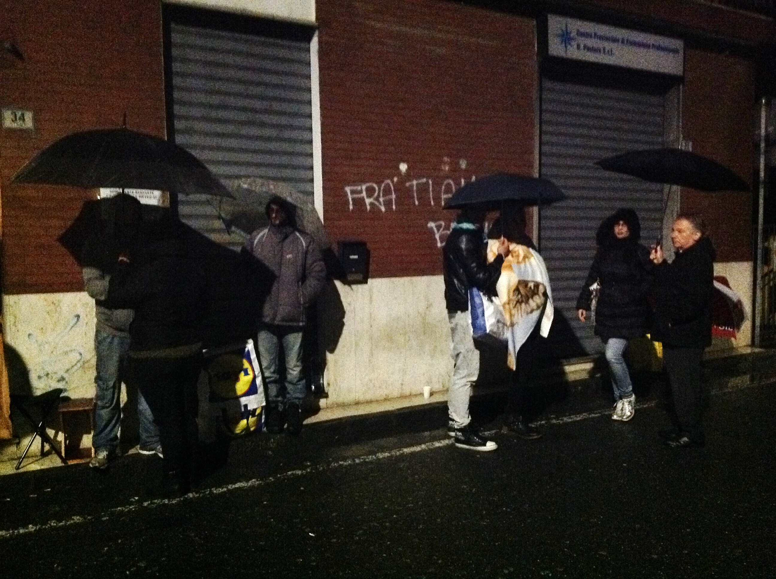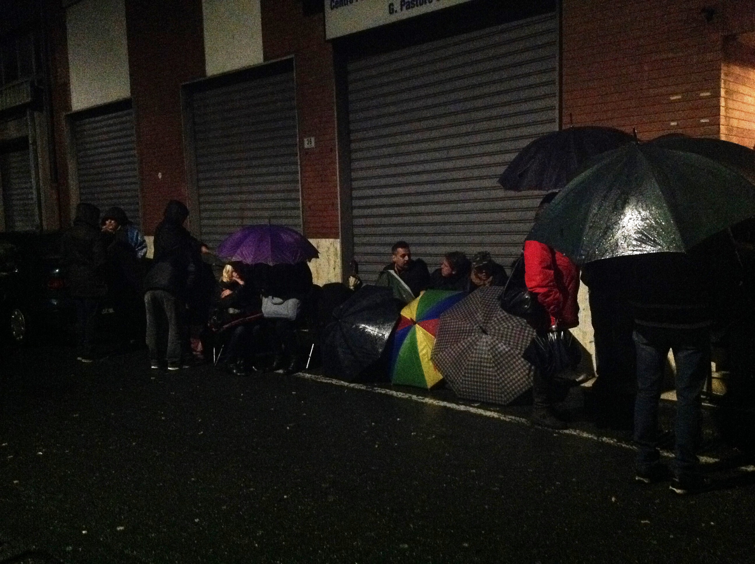 Ecco perchè Sonia, arrivata con il camper per poter trascorrere meglio la notte e dare a chi era con lei un piccolo sostegno, e altre cinquanta persone hanno passato tutta la notte all’addiaccio, senza alcun posto dove potersi riparare dalla pioggia incessante se non le scale di un palazzo e qualche ombrello. Coperte, piccole sedie da viaggio, dei panini e thermos di caffè. Sembra tutto il necessario per attendere magari l’inizio di un concerto, invece quella di ieri sera era l’attesa per la speranza di avere un lavoro. Alcuni residenti della zona hanno portato qualche coperta e qualche genere di conforto cercando di rendere questa notte di attesa un po’ meno dura. Assieme a loro uno stuolo di amici, fidanzati e parenti hanno trascorso la notte con i propri cari condividendo queste ore difficili.