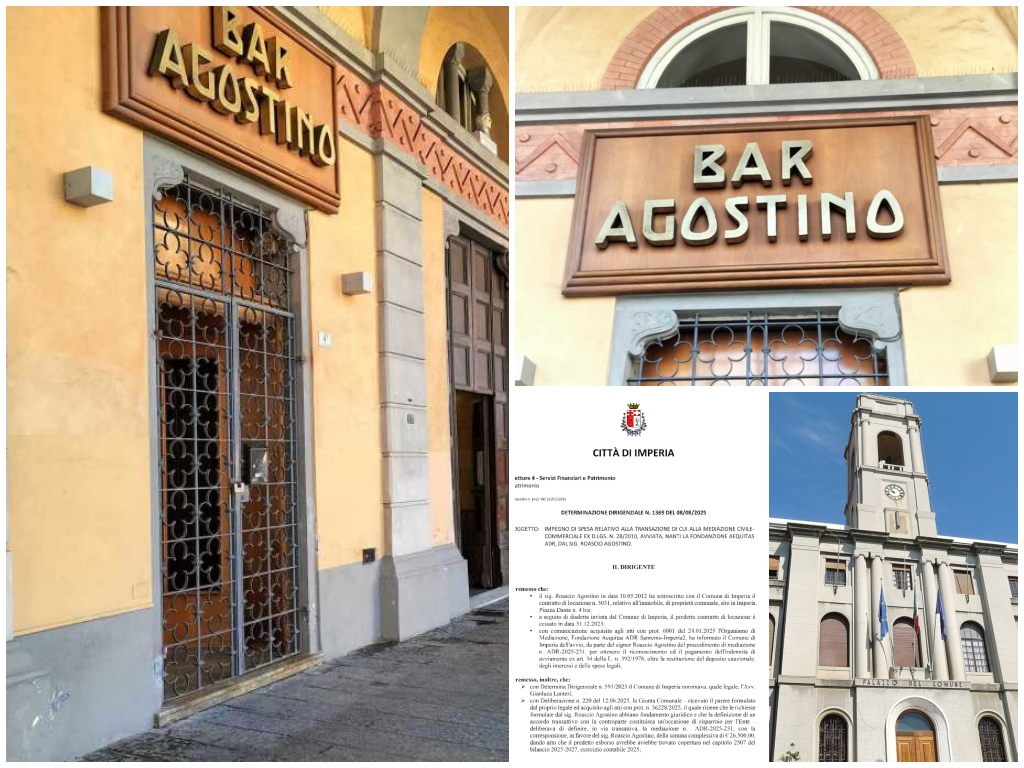 Il Comune di Imperia ha disposto il pagamento dell’indennità di avviamento, oltre alla restituzione del deposito cauzionale, degli interessi e delle spese legali, per un importo pari a 26.500,00 euro, nei confronti di Roascio Agostino, ex titolare dello storico bar “Agostino” di Piazza Dante, ormai chiuso dal 2023.