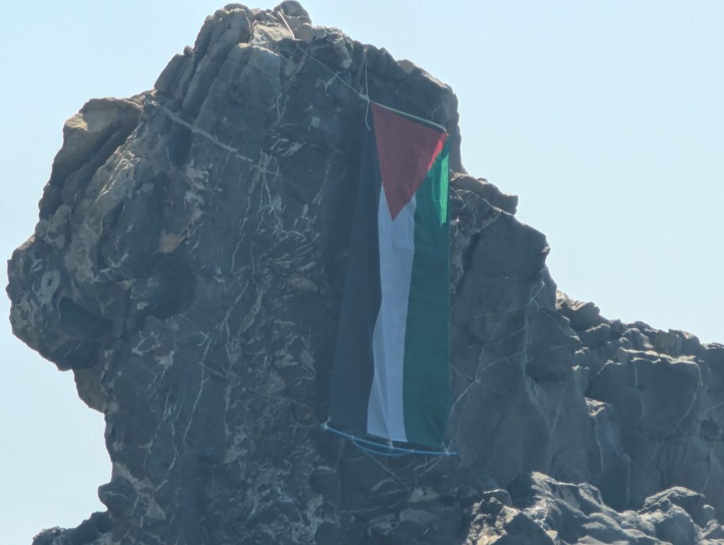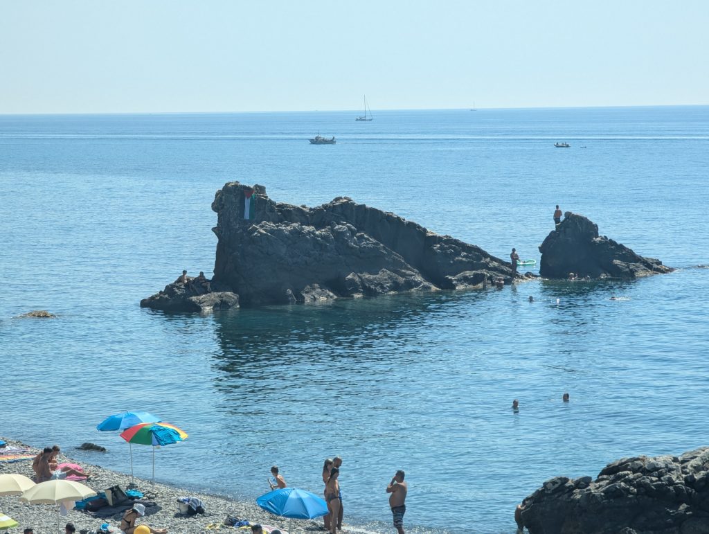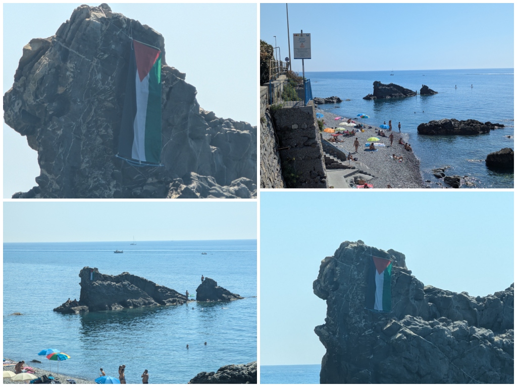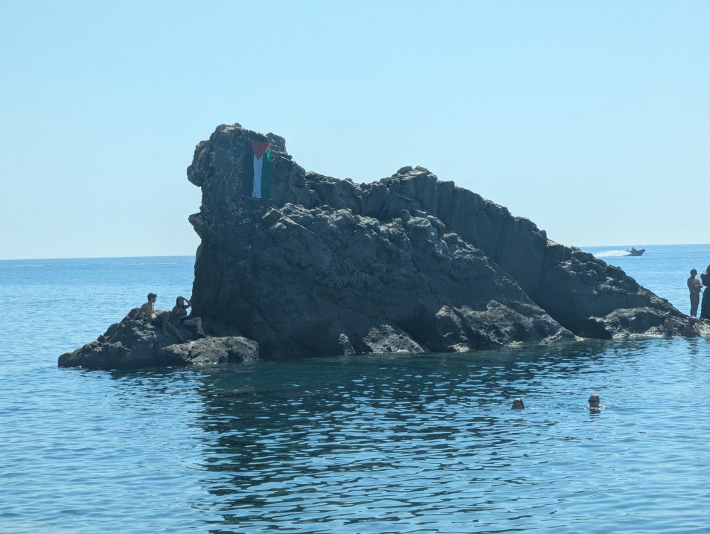 Una bandiera della Palestina è stata posizionata sullo scoglio della spiaggia della Galeazza, storica spiaggia libera di Imperia. Il gesto, di cui non si conosce l’autore, rappresenta un messaggio di solidarietà verso il popolo palestinese coinvolto nel conflitto in corso.