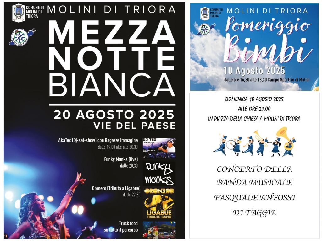 Il 10 Agosto presso il Campo Sportivo, il programma prevede a partire dalle 16,00 “Pomeriggio Bimbi 2025” con “Giochi Gonfiabili” (a cura del Parco Giochi Miriland) e a seguire “Duo Kida Show”( a cura della Fem Spettacoli), sempre il 10 Agosto alle ore 21.00 presso la Piazza della Chiesa ” Concerto della Banda Musicale Pasquale Anfossi di Taggia”.