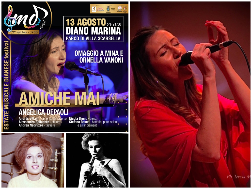 Amiche Mai, lo spettacolo-concerto che va in scena domani (mercoledì 13 agosto) a Diano Marina, nell’ambito dell’Emd Festival (appuntamento a Villa Scarsella, ore 21.30) è un viaggio tra le vite, le storie e le canzoni di Mina (pseudonimo di Anna Maria Mazzini) e Ornella Vanoni, due delle più grandi interpreti della seconda metà del secolo scorso.