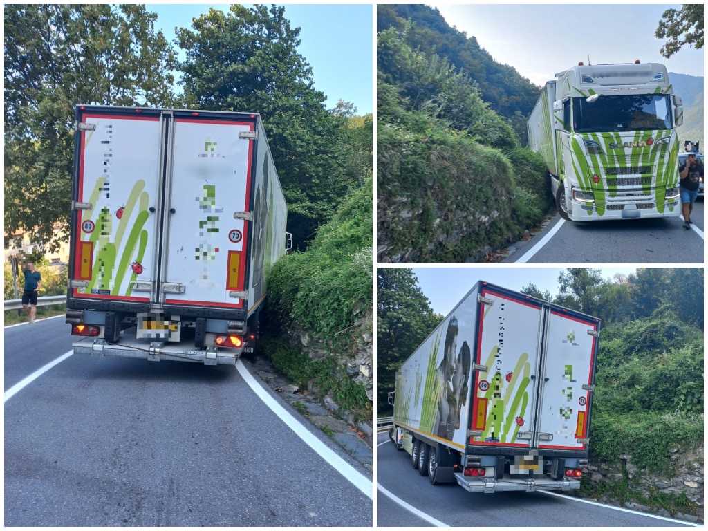 Nella giornata di ieri, 13 agosto, un tir è un uscito dalla strana, rimanendo incastrato in una cuneetta, mentre nell’altro senso di marcia transitava un secondo tir.