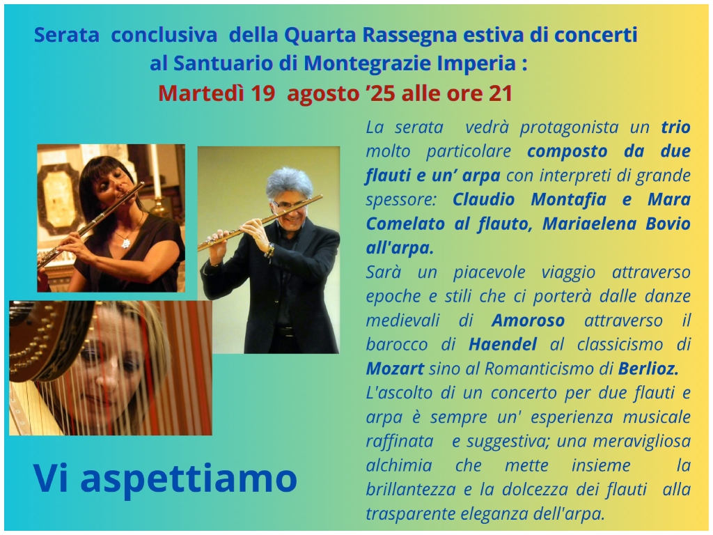 Protagonista un trio di concertisti composto da Claudio Montafia e Mara Comellato al flauto e Mariaelena Bovio all’arpa. Il programma è molto accattivante, vario e sorprendente: un piacevole viaggio che dalle danze Rinascimentali ci porterà sino al ‘900 passando attraverso brani di autori molto conosciuti quali Mozart, Berlioz, Rossini e Ibert.