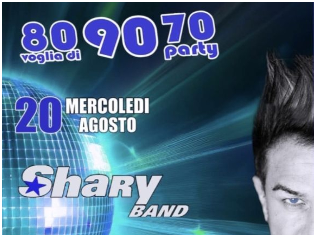 Martedì 20 agosto dalle ore 22.00 torna la Shary Band con l’ obiettivo di stra-divertire, ultra-divertendosi, il pubblico: una ricetta vincente da sempre. L’ elemento conduttore della filosofia di Shary è il sorriso simbolo del sano divertimento!