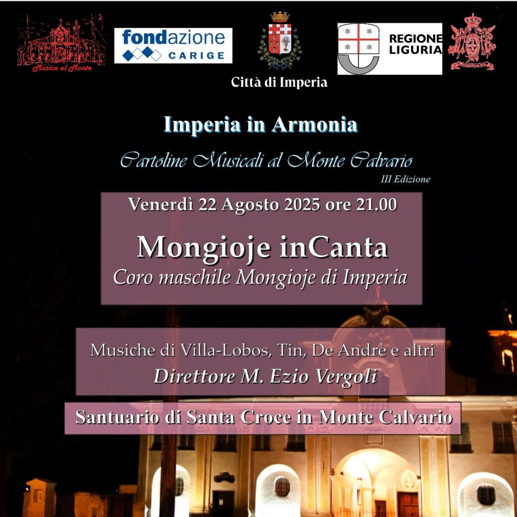 L’estate musicale presso il Santuario di Santa Croce in Monte Calvario si chiude venerdì 22 agosto con il concerto “Mongioje inCanta” del Coro maschile Mongioje, ultimo appuntamento della terza edizione di “Imperia in Armonia“. L’iniziativa è stata ideata dai musicisti imperiesi Raffaele Feo e GianLuca Ascheri.