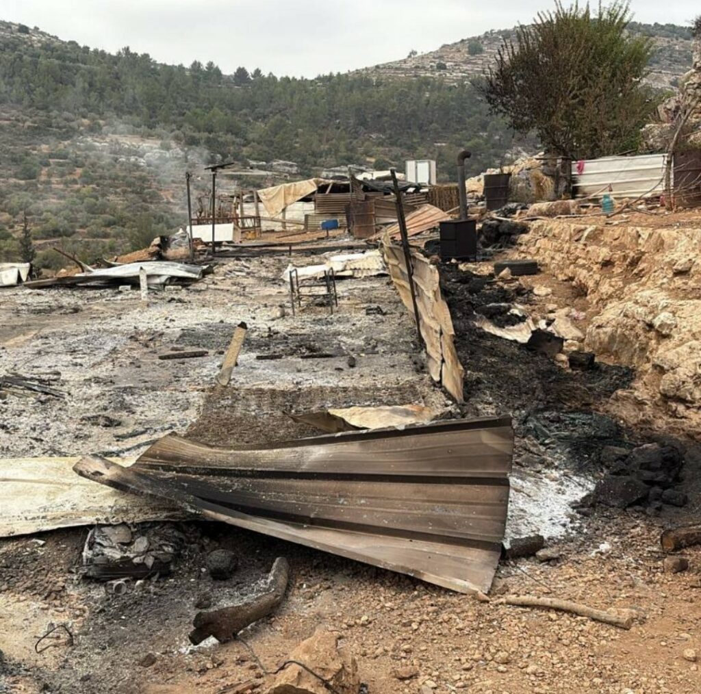 Comunità beduina di Ein Ayyoub vicino a Dair Amman, a ovest di Ramallah. L’ennesimo attacco dai coloni si è concluso con l’ingiunzione agli abitanti di andarsene in 24 ore (!); l’esercito, giunto dopo l’assalto, ha ordinato alla comunità di abbandonare tutto entro una settimana, ma la sera stessa i coloni hanno lanciato un drone con il messaggio che intimava di andarsene entro le 7 del giorno successivo. Forse, per essere più convincenti, nella notte sono tornati ed hanno dato fuoco alle strutture della comunità (foto). L’esercito l’ha dichiarata zona militare chiusa. Ora le 130 persone che vivevano di pastorizia sono costrette ad andarsene… ma dove… se il progetto di colonizzazione prevede il furto di tutta la Palestina? Tantissimi che ora vengono cacciati dalle loro terre appartengono a famiglie che avevano già perso tutto nel 1948, con la Nakba, altri vivono nelle terre dei loro avi. Dove? Alcuni nostri attivisti sono stati con la gente, al loro fianco rischiando l’arresto.