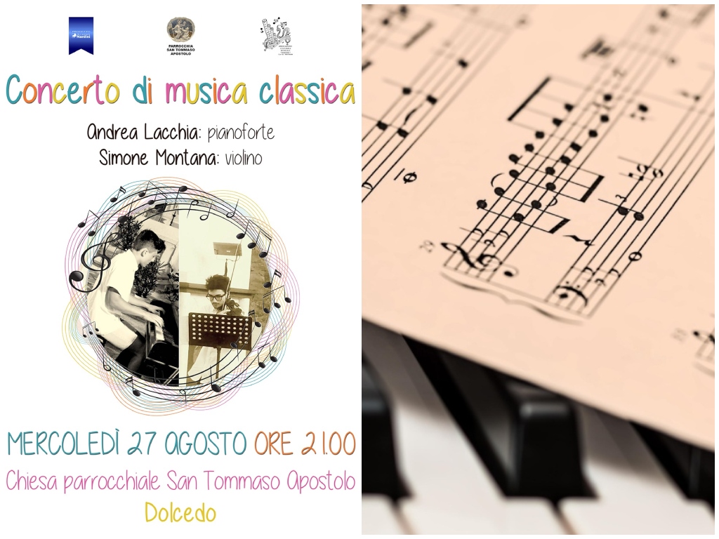 La chiesa parrocchiale di San Tommaso a Dolcedo torna a farsi cornice di un evento musicale di grande attrattiva. Mercoledì 27 agosto alle ore 21 si terrà un concerto di musica classica che vedrà protagonisti due giovani talenti del panorama ligure: Andrea Lacchia al pianoforte e Simone Montana al violino.