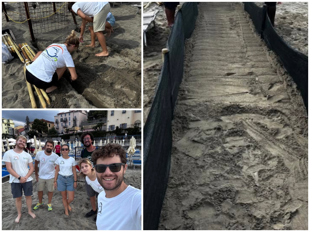 Intanto però i biologi e i volontari di Delfini Del Ponente, coordinati dal GLIT e dall’ente capofila l’Acquario di Genova, hanno finito di allestire un corridoio ombreggiato (che delimita il percorso che, si spera, le tartarughine dovrebbero fare per arrivare dal nido al mare) e hanno iniziato i monitoraggi h24 al nido. Cosa si fa ora? Si aspetta, con pazienza!