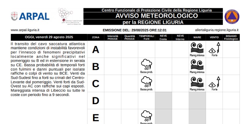 Oggi sulla Liguria permangono condizioni di instabilità, favorevoli all’innesco di temporali localmente anche significativi, soprattutto al pomeriggio sul centro della regione, in estensione in serata sul levante. Rientrano nello scenario di bassa probabilità di temporali forti con fulmini e danni puntuali per isolate raffiche o colpi di vento su BCE.