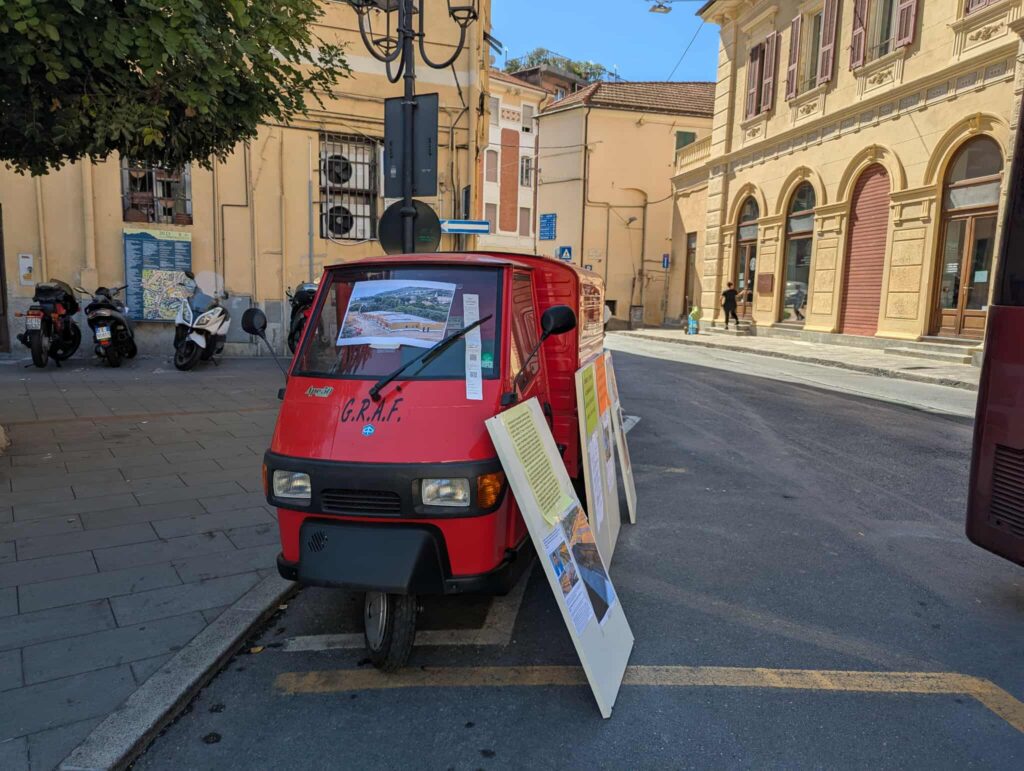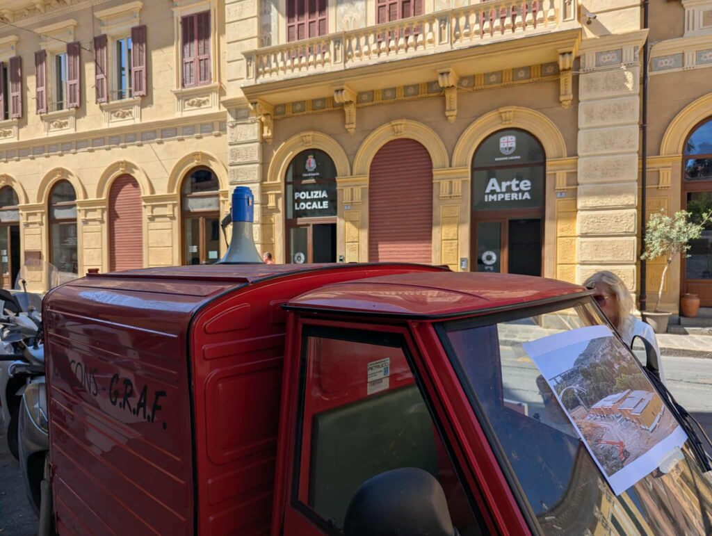 Ieri sera ho portato qui l’Ape. L’ape è un 50 di cilindrata e può stare nello spazio dei motorini. È più largo di un motorino, quindi per farlo stare nel limite della riga bianca ho messo la ruota posteriore destra sul marciapiede. Incredibile, mi hanno fatto la multa per la ruota sul marciapiede.
