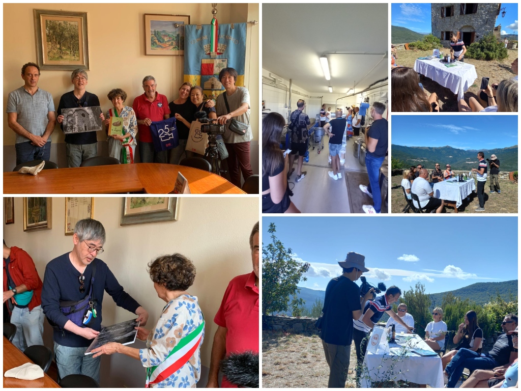 Miyako era già stata a Lucinasco, ma dieci anni fa. I luoghi belli non si dimenticano e così è tornata per considerare lo stato di luoghi in cui i giapponesi si sono trovati veramente bene. Va detto, l’evoluzione c’è stata. Si parte con gli incontri istituzionali, dato che i nipponici vengono ricevuti dal sindaco Marilena Abbo. Si passa poi all’emozionante incontro con le famiglie che erano state protagoniste nel primo documentario, quello di dieci anni fa: si tratta di quelle di Adamo Solinas, già Carabiniere, accompagnato dalla moglie Maria Luigia e di Cristina Armato con Adriano Blengini. Questi ultimi sono impegnati da anni nella crescita della loro azienda familiare, legata alla produzione olearia, alle olive Taggiasche in salamoia e allo sviluppo turistico dell’abitato. In forza di quest’ultimo aspetto, gli ospiti hanno visitato il sistema museale di Lucinasco e poi hanno vissuto esperienze approfondite legate alla conoscenza dell’olio extravergine locale. Nel frangente, la guida d’eccezione è stato Adriano, assaggiatore ONAOO e che proprio della scuola ONAOO, ha parlato, perché si tratta di una istituzione primaria nel mondo per il contesto oleario e, come tale, ben conosciuta anche nel paese del Sol Levante.