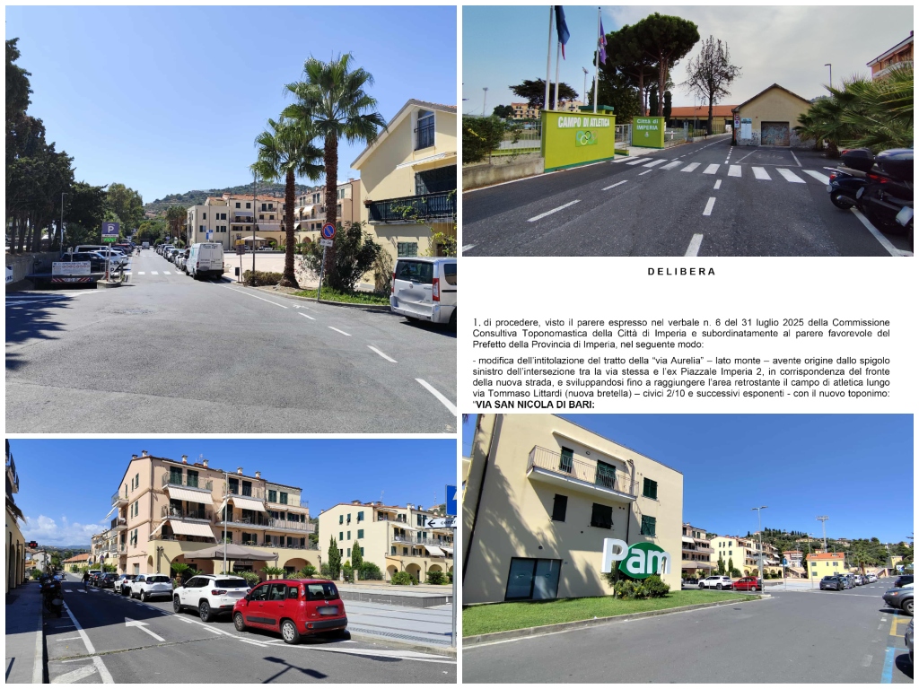 La Giunta comunale di Imperia, con votazione unanime e palese, ha deliberato lo scorso 10 settembre per il cambio di nome della diramazione a monte di via Aurelia dal civico 2 al civico 2/10 e successivi esponenti, che si sviluppa fino a raggiungere l’area retrostante il campo di atletica lungo la via Tommaso Littardi attraverso la nuova bretella in “via San Nicola di Bari“.