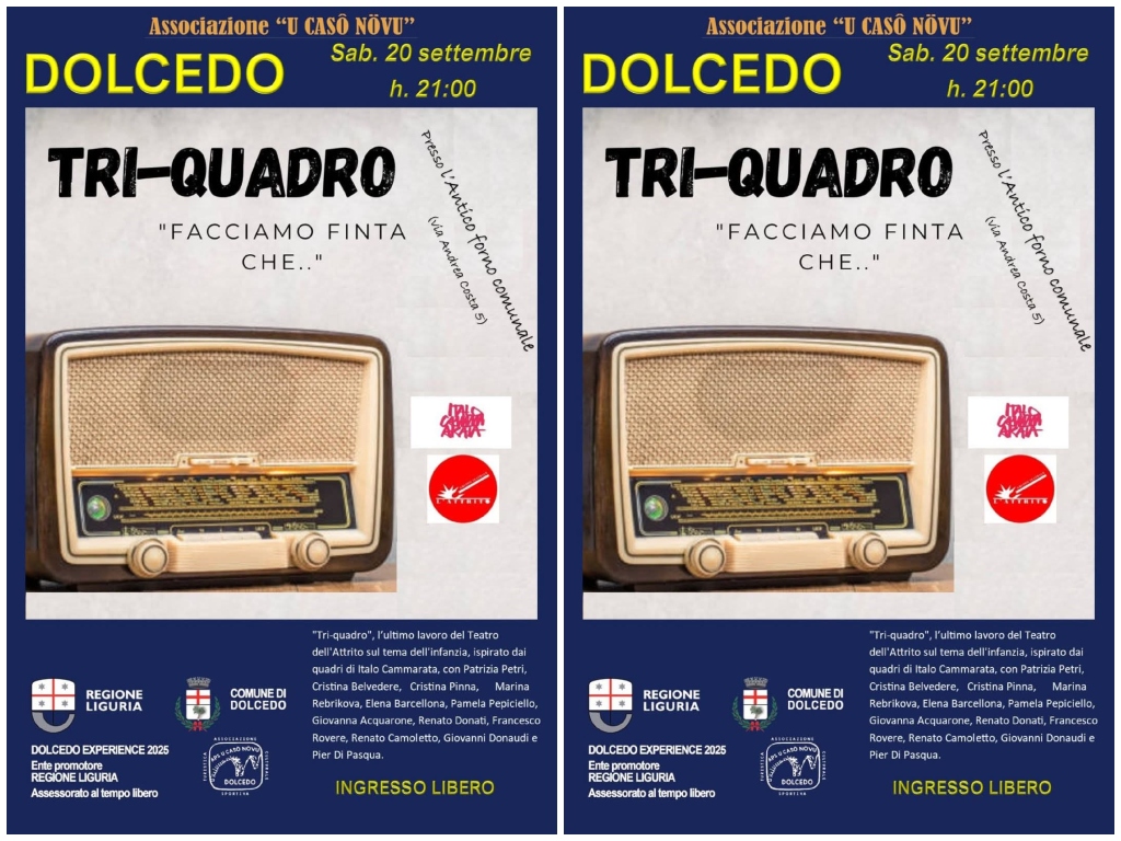 Sabato 20 settembre alle ore 21, presso l’associazione U Caso Novu a Dolcedo, il Teatro dell’Attrito porterà in scena lo spettacolo Triquadro, incentrato sul tema dell’infanzia e ispirato ai quadri del maestro Italo Cammarata.